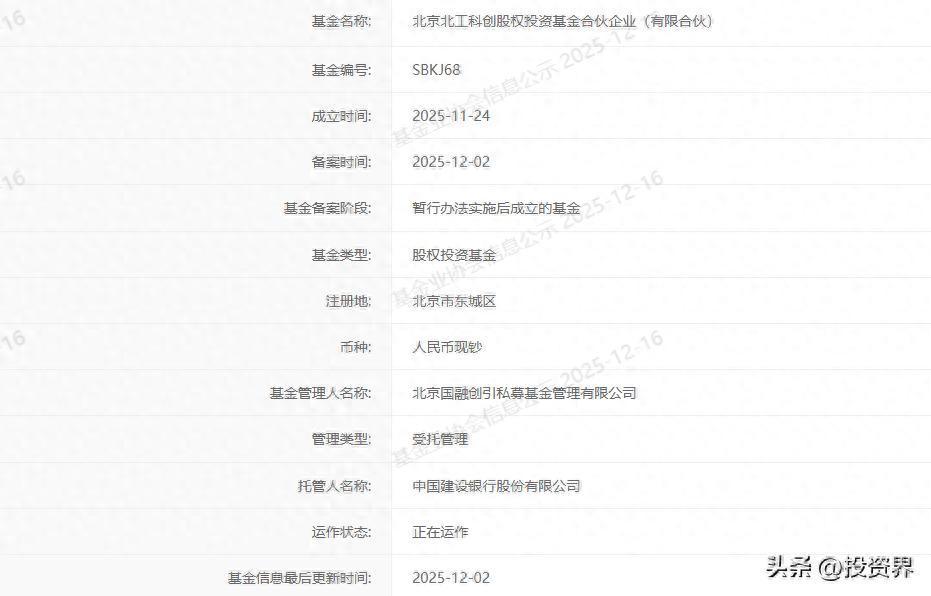 投资界(ID:pedaily2012)12月16日音问,近日,由北京国资公司所属北工投资与北京国管旗下北创投共同发起建造的北京北工科创股权投资基金合股企业(有限合股)(以下简称“北工科创基金”)在京认真成立,该基金聚焦“科技革命引颈产业革命”主题,限制3亿元,当今已完成中国证券投资基金业协会备案。