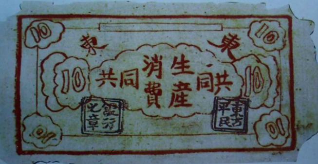 东固遗民银行建立之后,就开在破钞结合社的傍边,日间银行的东说念主会帮结合社去卖货,晚上结合社的东说念主会帮银行来印纸币。这个纸币即是由原先的铜元票升级而来,一共有四种面额,单元不是元,而是枚:10枚、20枚、50枚、100枚,不错兑换相应数目的铜币。银行还不错作念进款、贷款、兑换这些业务。