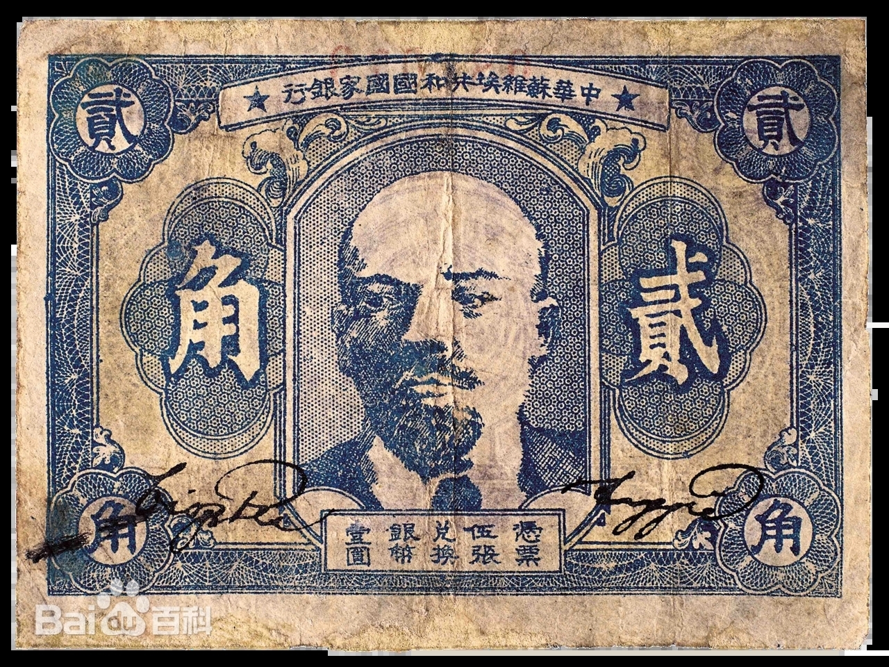 贰角苏币印有列宁头像,底部是邓子恢和毛泽民的签名