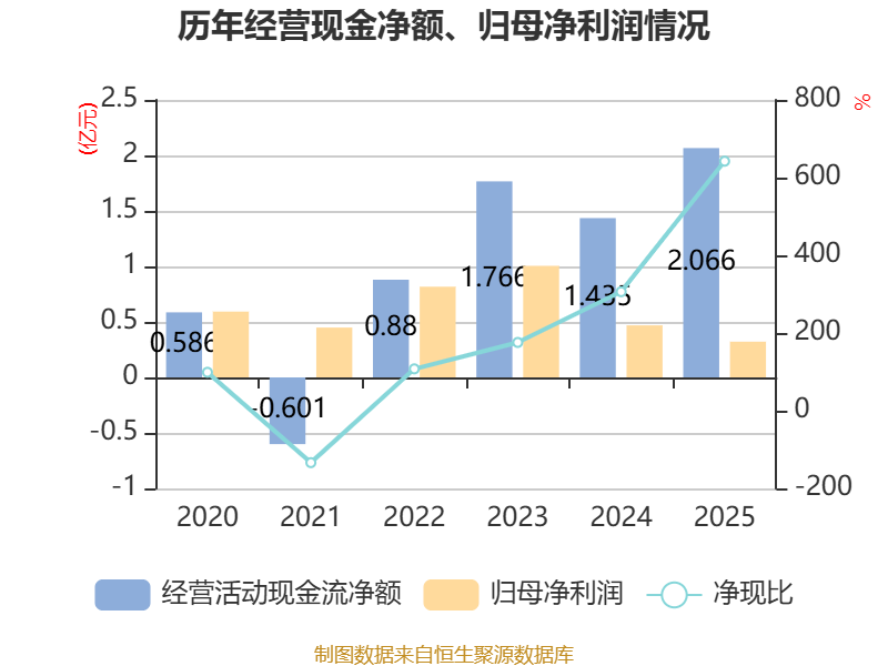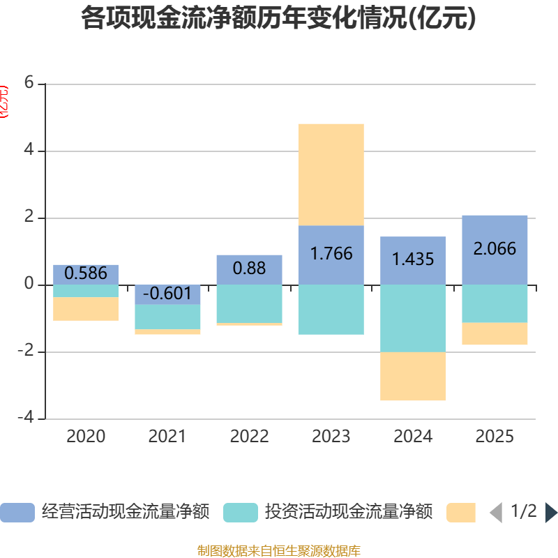按捺2025年,公司操办行径现款流净额为2.07亿元,同比增长43.92%;筹资行径现款流净额-6546.65万元,同比加多7879.29万元;投资行径现款流净额-1.14亿元,上年同时为-2.02亿元。