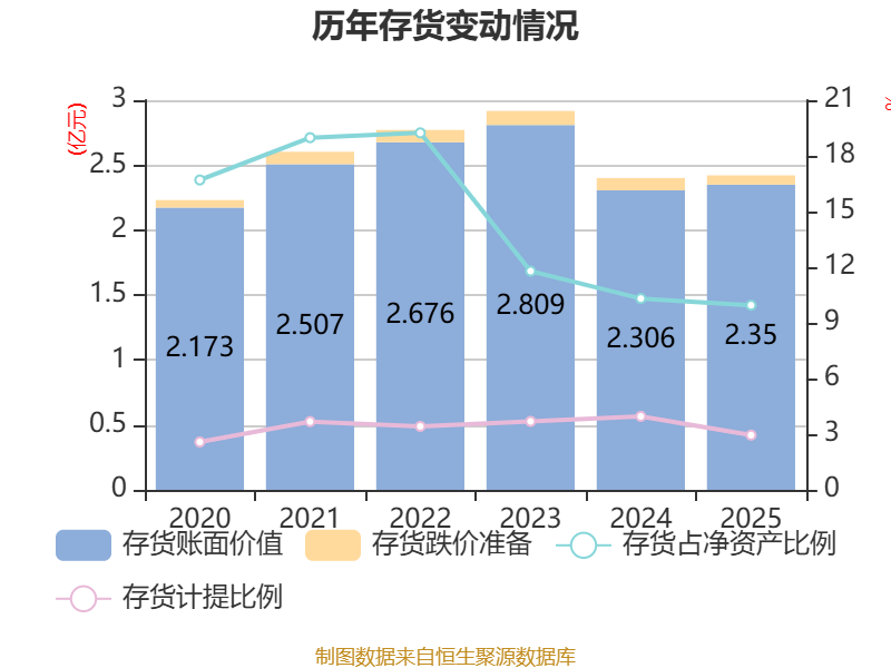 从存货变动来看,按捺2025年末,公司存货账面价值为2.35亿元,占净金钱的9.95%,较上年末加多434.34万元。其中,存货跌价准备为714.87万元,计提比例为2.95%。