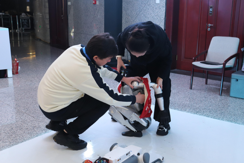 展览现场,智能机器东谈主正在进行责任准备。曾丹 摄